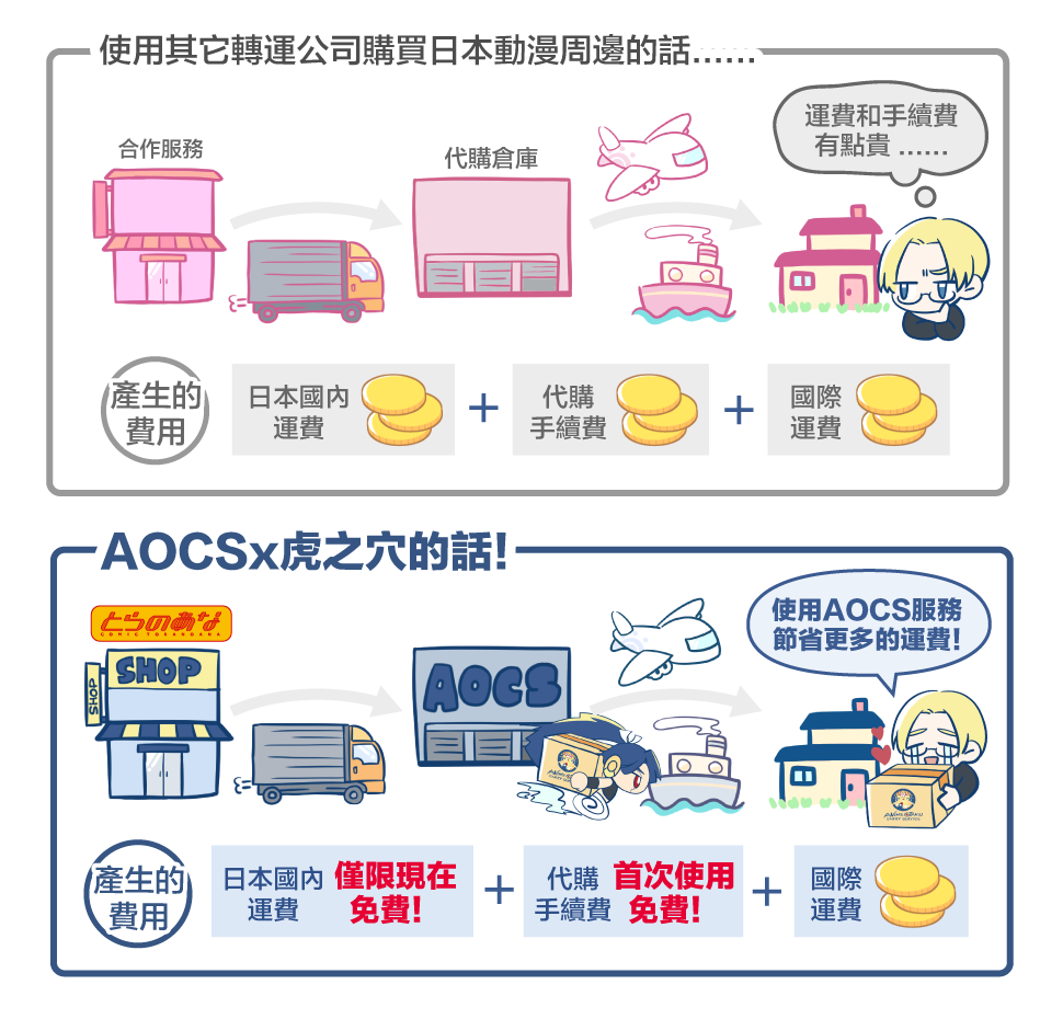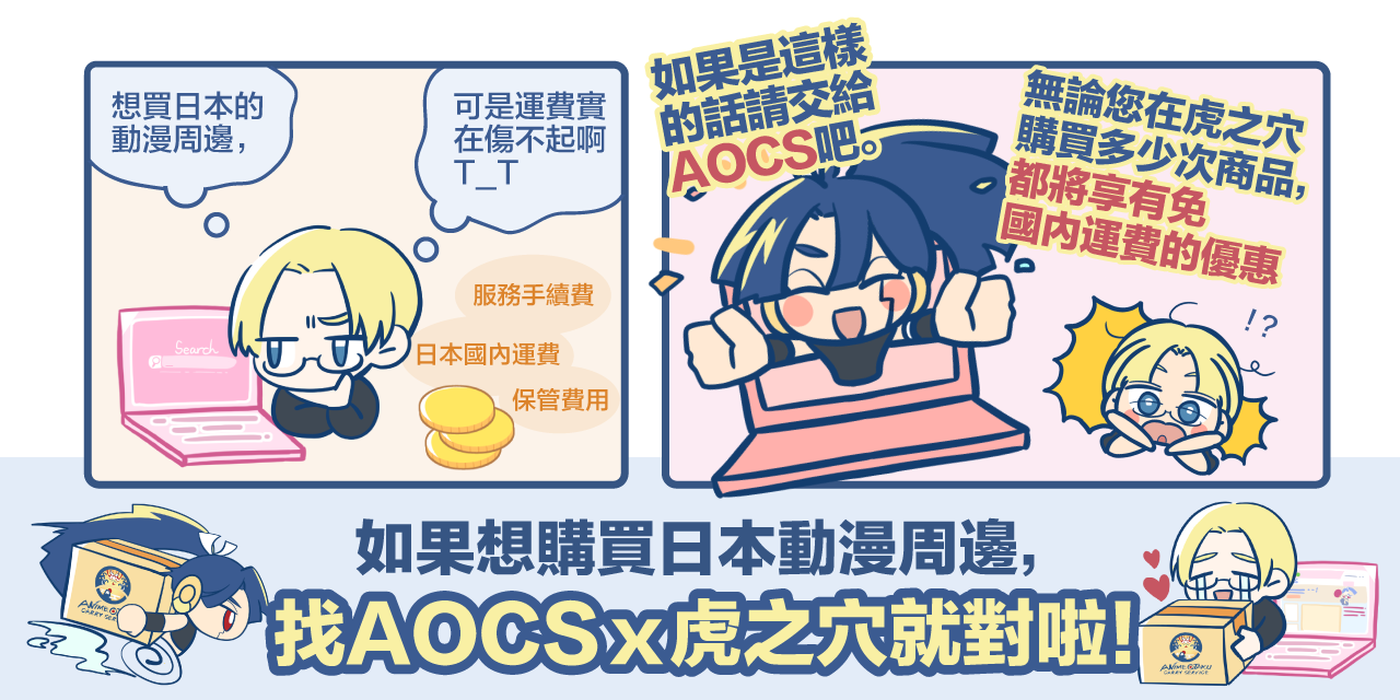在AOCS的合作夥伴虎之穴網站上購物,無論多少次,日本國內運費皆為免費喔!!若是利用我們的合併發送功能,更可以一次節省好幾筆國際運費!